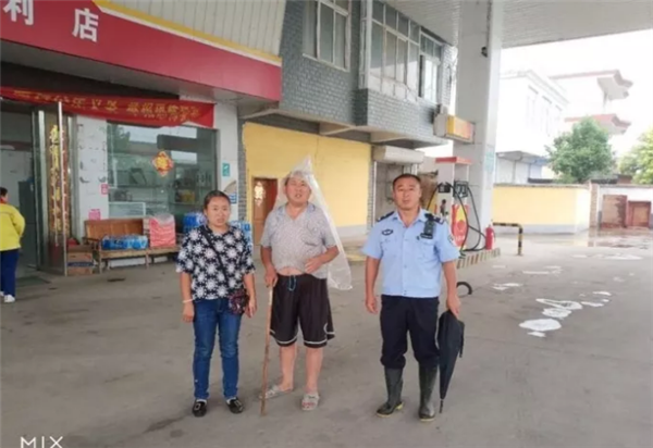 熟悉辖区环境的民警开着警车带上张大姐,在张大爷曾经说过的地点附近沿路询问。功夫不负有心人,在多次询问毫无线索的情况下,民警远远看到一个加油站内停着一辆人力三路车,旁边站着一名头顶塑料布躲雨的老人。随着民警手指的方向,张大姐看了一眼,热泪盈眶:“谢谢你们,谢谢,那就是我爸!”